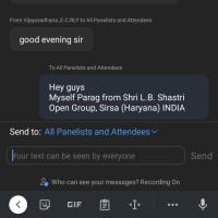 Hey Everyone, Myself PARAG from HARYANA {Shri L.B. Shastri Open Group, Sirsa (Haryana) INDIA}. My participate ID for the 4th day of the webinar via ZOOM is 34890981.