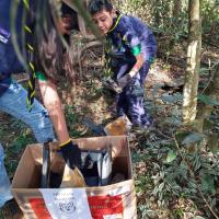 Separamos equipes, as quais todas com as EPI's necessárias se dividiram para fazer a coleta de lixo espalhadas pelo local.