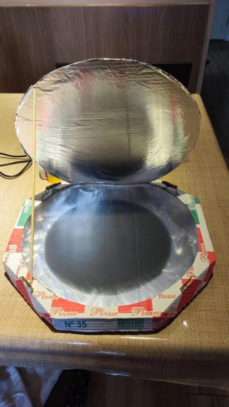 Em maio de 2024, construímos um forno solar com uma caixa de pizza, utilizando materiais simples como papel-alumínio, filme plástico e papel preto. A caixa foi modificada com uma “janela” cortada na tampa e revestida internamente para refletir e absorver a luz solar, criando um efeito estufa. A aba da tampa foi ajustada para direcionar a luz refletida para o interior da caixa, onde pizzas foram aquecidas.