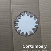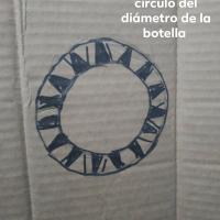 PASO 1. Usaremos el carton y en el dibujaremos un circulo del diametro de la botella, puedes hacerlo primero con lapiz y despues remarcarlo con plumon. Despues dibujaremos unos dientes de 2 cm de largo, esos serviran de soporte para la botella dentro del carton. Despues cortaremos el contorno. (pueden guiarse con las fotografias)