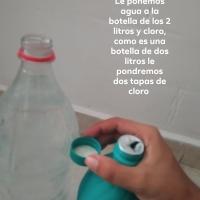 PASO 2. LLenaras de agua la botella de dos litros y le hecharemos cloro, dos tapas de cloro (la porporcion es una tapa por litro).