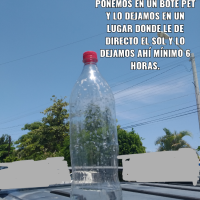 PASO 3. Una vez tenga el agua, en un bote pet almacenaras el agua y lo pondras en un lugar donde el sol directo y lo dejaras ahi minimo 6 horas. RECOMENDACION (11 AM A 6 PM COMO MINIMO). Una vez pasen esas horas mínimo, el agua ya será bebible !! :)