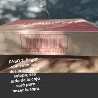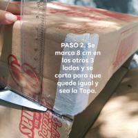 PASO 2. Despues deje esa caja a un lado y agarre la que usare para la tapa, (si te llegas a confundir en este paso de la descripcion puedes guiarte con las fotos :)), segui usando las tijeras y corte tres solapas de esta (las 2 mas pequeñas y una de las mas largas), como use un lado de la caja para convertirlo en tapa para mi estufa, pegue con cinta los dos lados de la solapa que que no corte (es el que use para Tapa y te puedes guiar con las fotos), medi usando la regla esa solapa y me dio 8 cm, medi los otros lados 8 cm y lo marque con el plumon para despues cortarlo. Al final me quedo la Tapa de mi estufa.