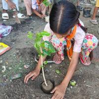 Last year we selected a green belt for planting trees. And we all planted around 100 trees there. Today that green belt has turned green and the trees have grown. Today once again we planted trees on the empty space on the green belt and other empty spaces nearby. The trees that all the children had planted last year have now grown. All the children were very happy to see their trees grow, flowers had also bloomed in some of the trees.