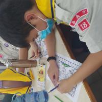 週三下午,同學分成4組,學生在一片空地上課(炙熱難耐),沒有教科書、沒有課程標準,團長一個三指手示即瞬間靜寂一片,時而卻學習認真、時而討論熱烈~國中生的專注力是可以訓練的。