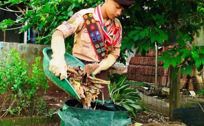 aksi anak Pramuka yang membersihkan area sekolah