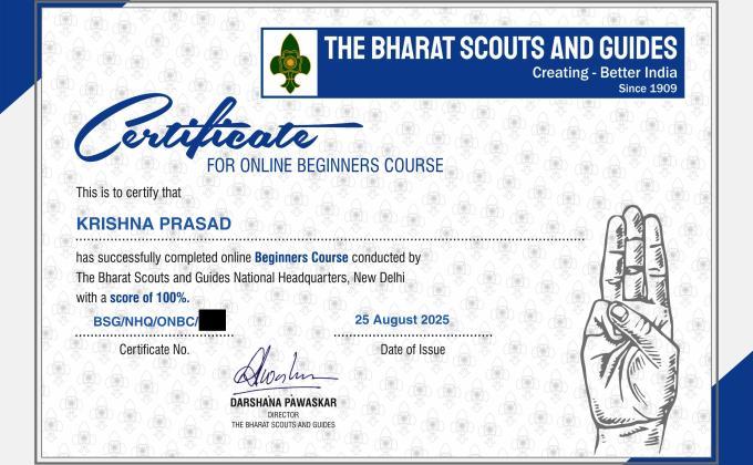 My Journey of Completing the Online Beginners Course with The Bharat Scouts and Guides On 25th August 2025, I proudly received my Certificate for Online