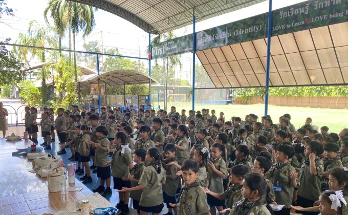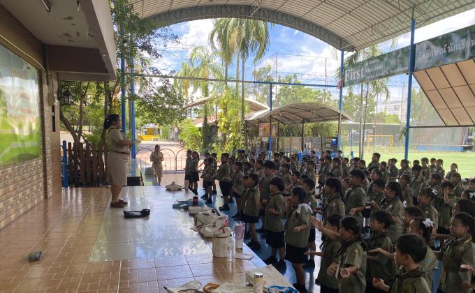 ลูกเสือเนตรนารีเข้าแถวเคารพธงชาติ