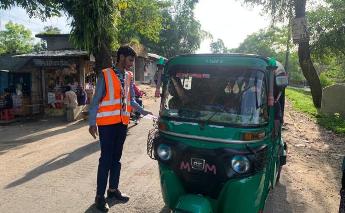 ট্রাফিক সচেতনতা বৃদ্ধিতে লিফলেট বিতরণ করি