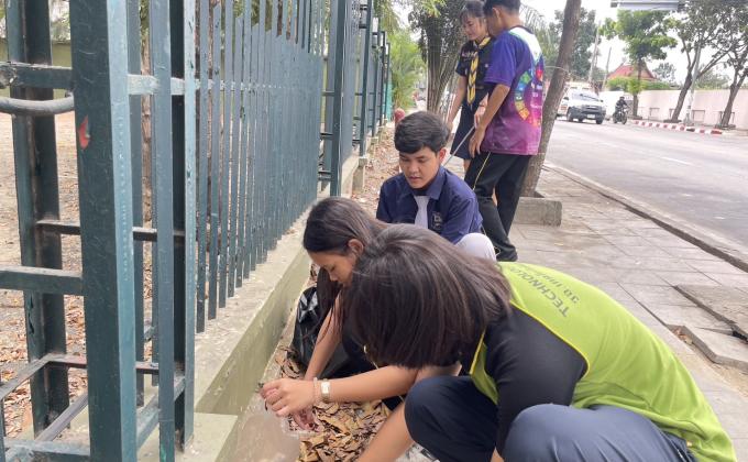 นำนักเรียนทำจิตอาสาเก็บขยะบริเวณริมฟุตบาท