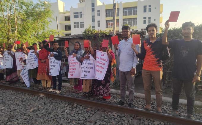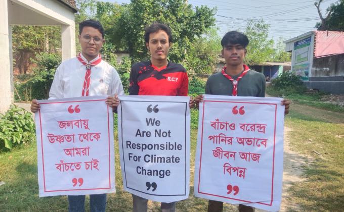 Three Star Open Scout Group, Varendra Youth Forum, Surya Kiran Samaj Kalyan Sanstha, Rajshahi have displayed red cards demanding climate justice in Baharampur