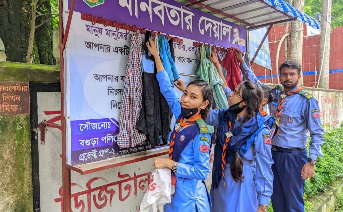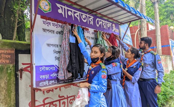 Members of Bogura Polytechnic Institute rover Scout Group initiated the create a "Humanity wall" programme on 7/4/2]24 to 9/4/2024 at Colony , Bogura sadar...