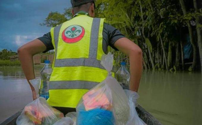 Bangladesh Scout next to the flood victims