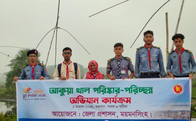 To mark National Youth Day 2024, Rover Scouts from Mymensingh joined a cleanup drive at Akua Canal — a polluted waterway harming both nature and the community