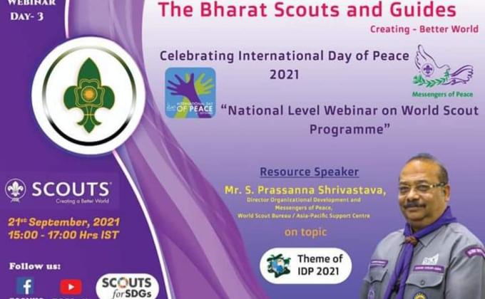 21 Sept: The Bharat Scouts and Guides Celebrated International Day of Peace 2021. National Level Webinar on World Programme. Today it was on THEME OF IDP 2021
