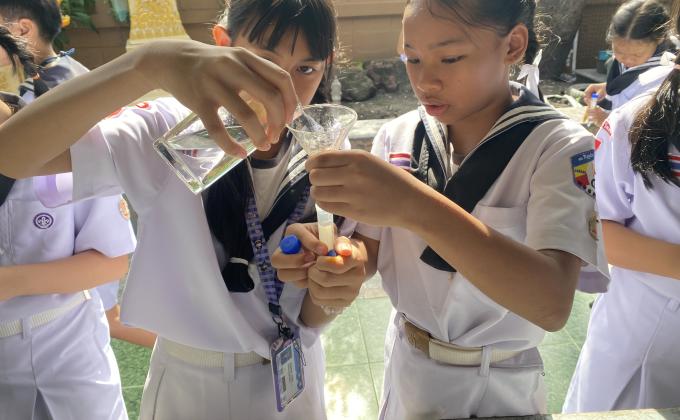 นักเรียนมีการใช้ถุงที่เป็นกระดาษและพลาสติกที่สามารถย่อยง่ายเพื่อป้องกันการพังทลายและช่วยลดสภาวะโลกร้อนอีกด้วย