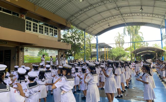 จิตอาสาดูแลนักเรียนในการเข้าแถวและความเรียบร้อยในการเข้าแถว